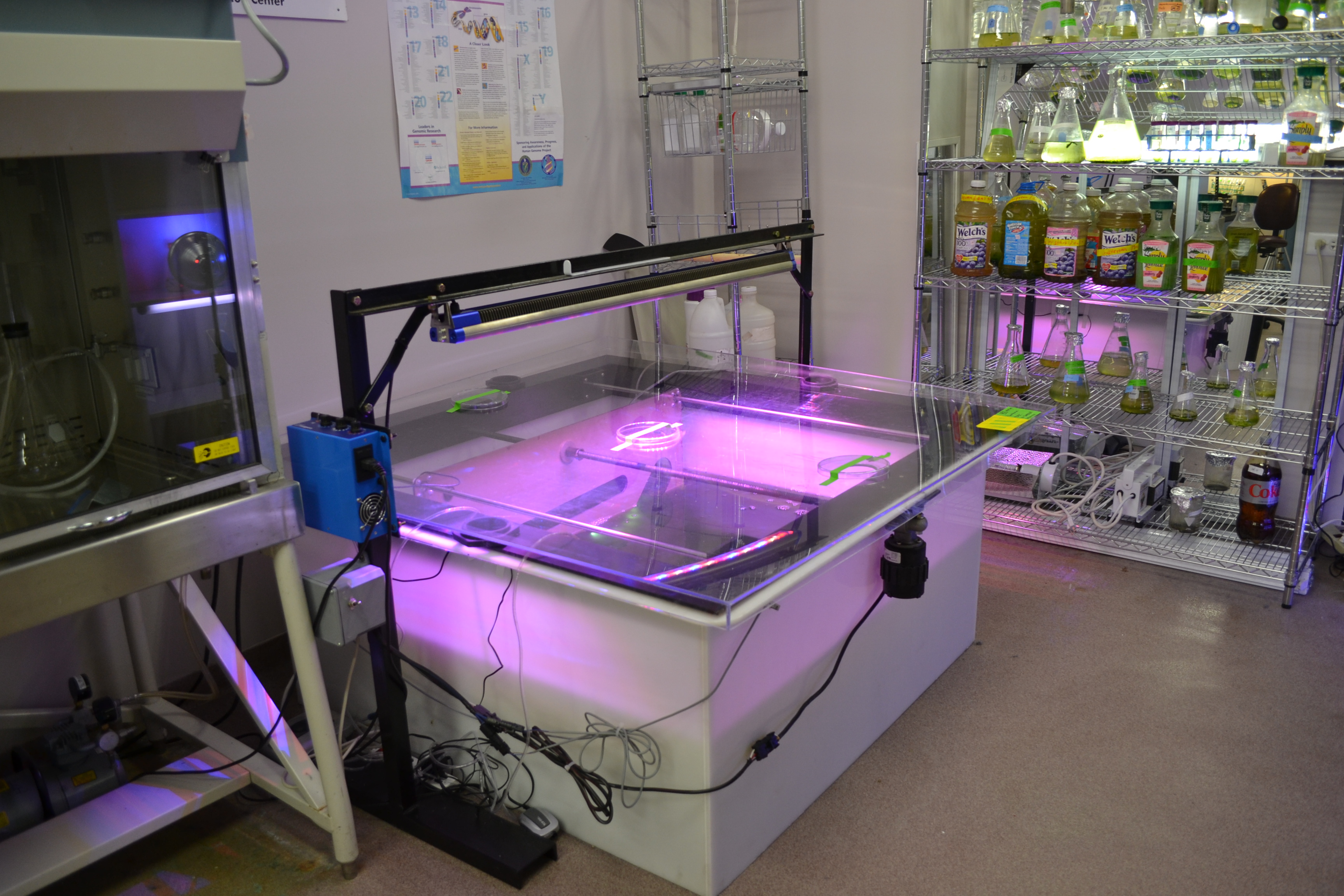 Student projects in our indoor lab include microbial fuel cell (MFC) research (pictured on the left) and indoor bioreactors, algae growth research ponds (pictured on the right), water remediation, and enhancements to traditional biodiesel production methods