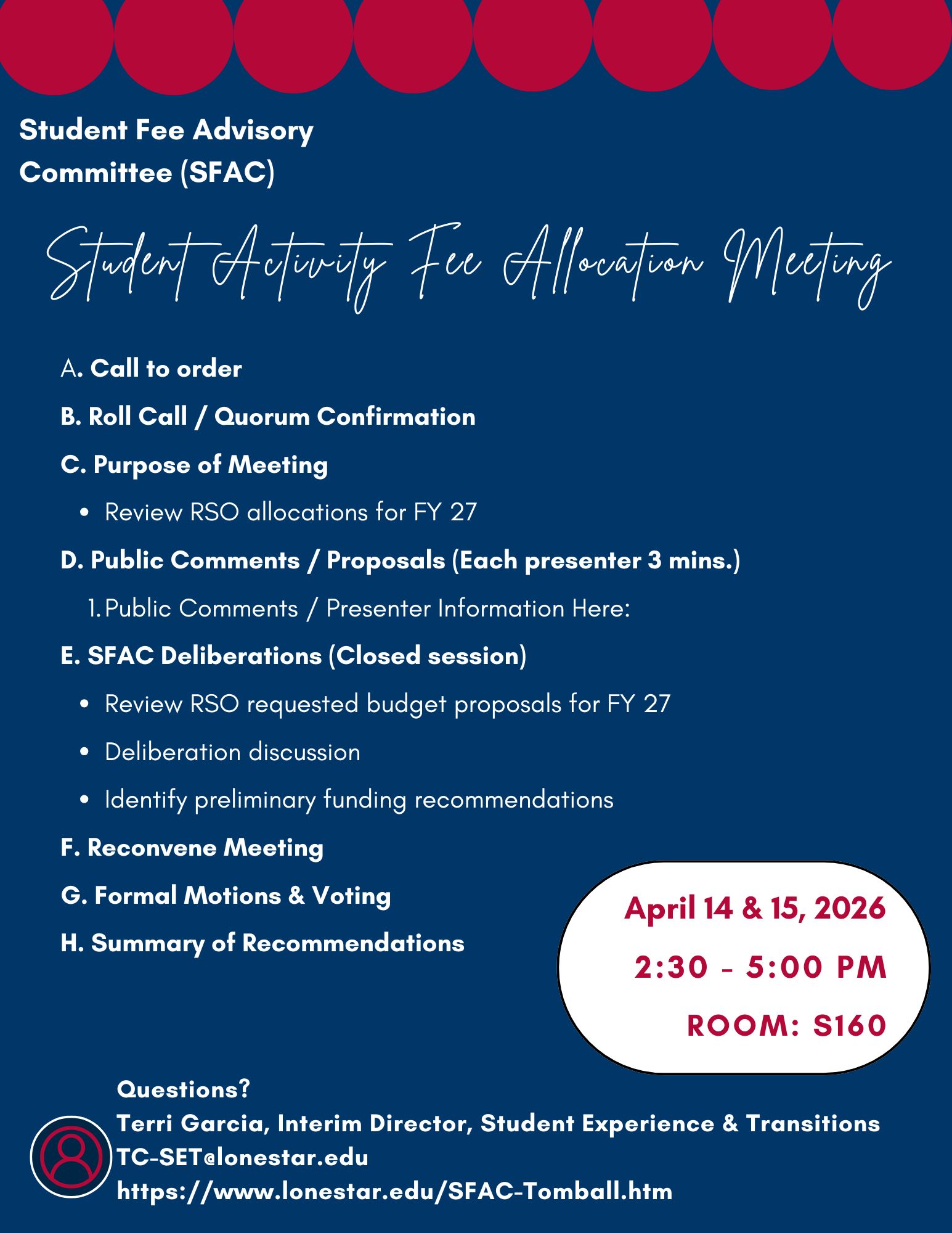 The Student Fee Advisory Committee will convene to deliberate on FY27 funding requests.