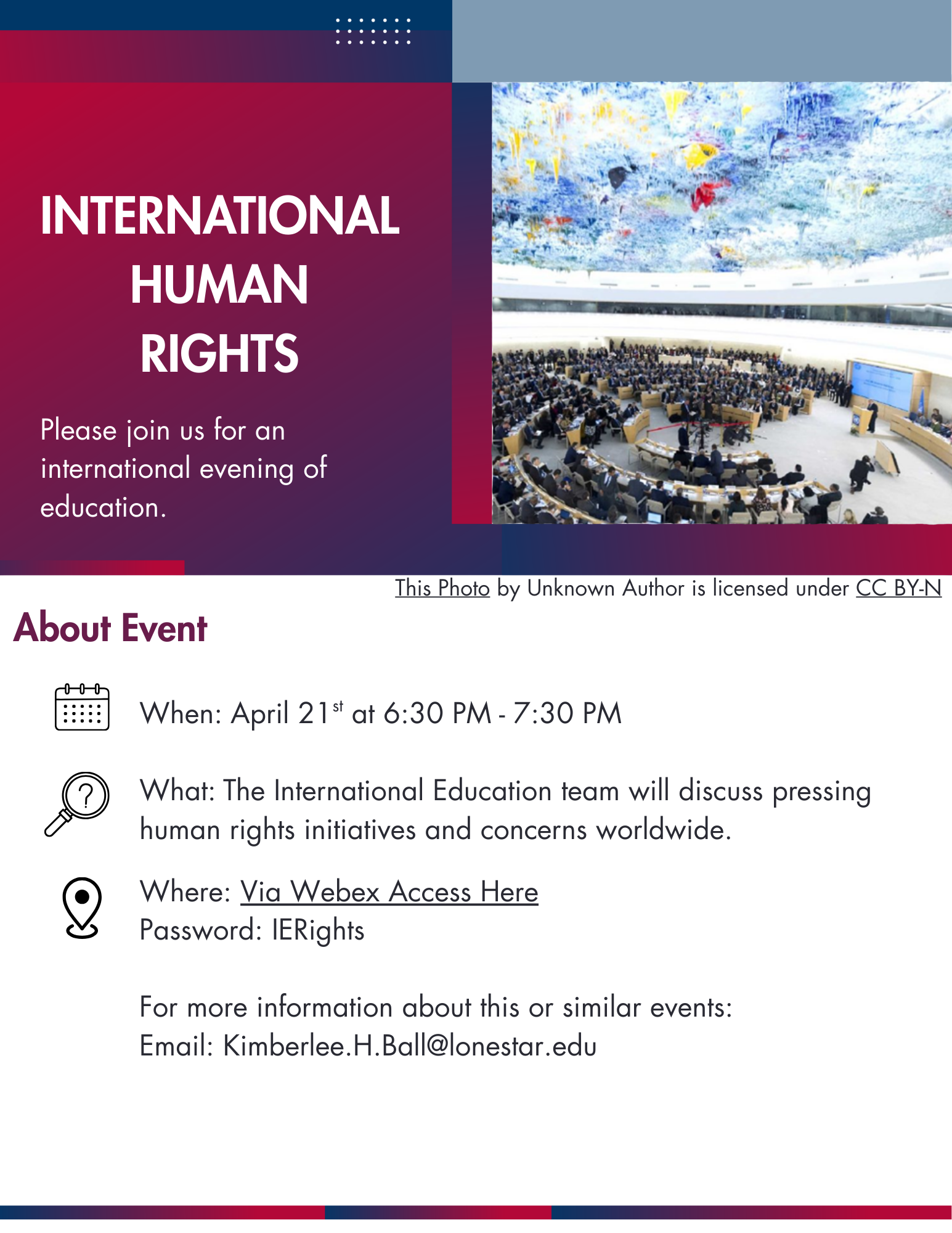 | 04/21/2026 | International Evening Human Rights | 6:30 PM - 7:30 PM | Webex | Flyer | |