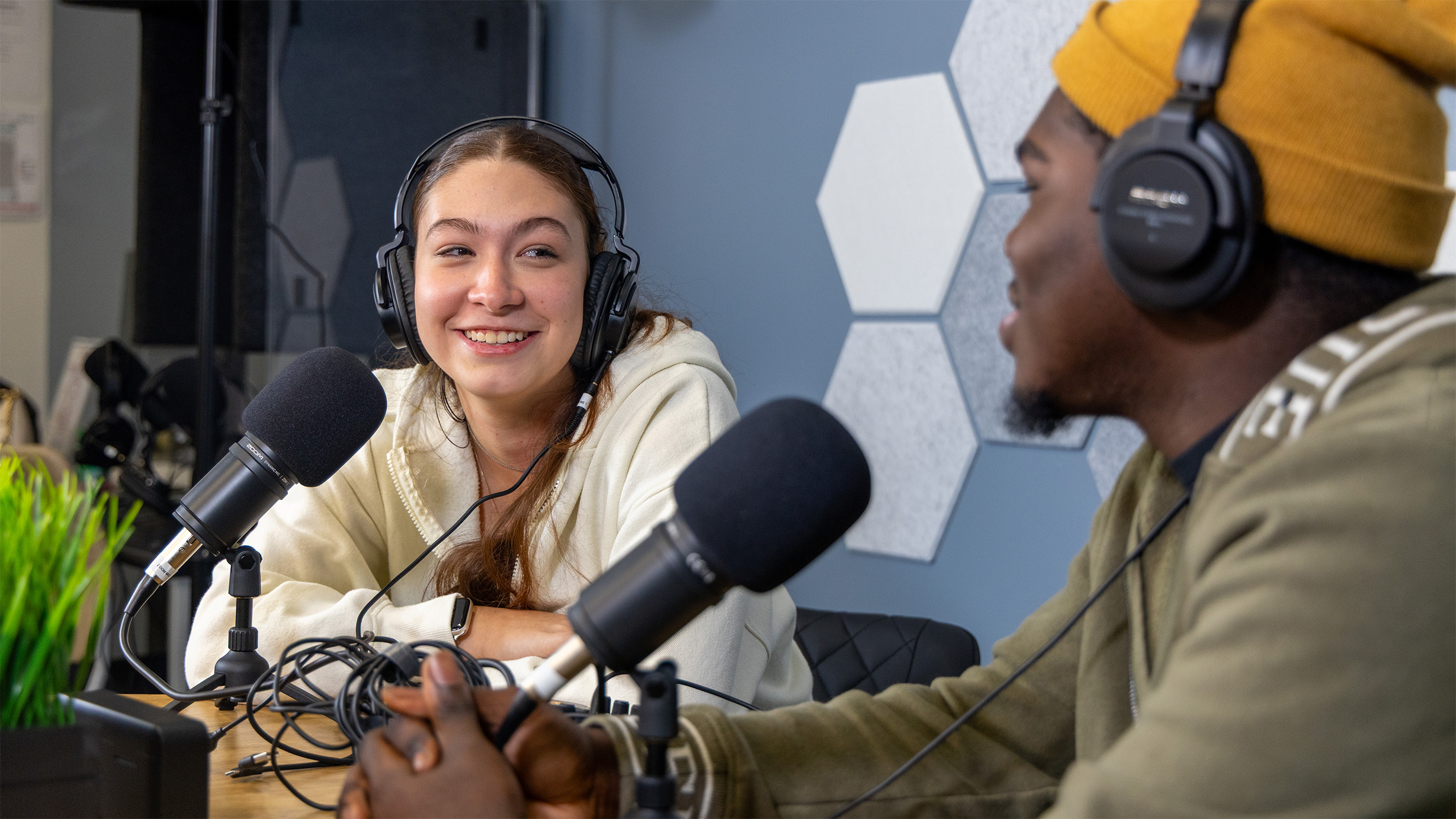 - You may adjust the lighting for your podcast using the two light stands located next to the camera.