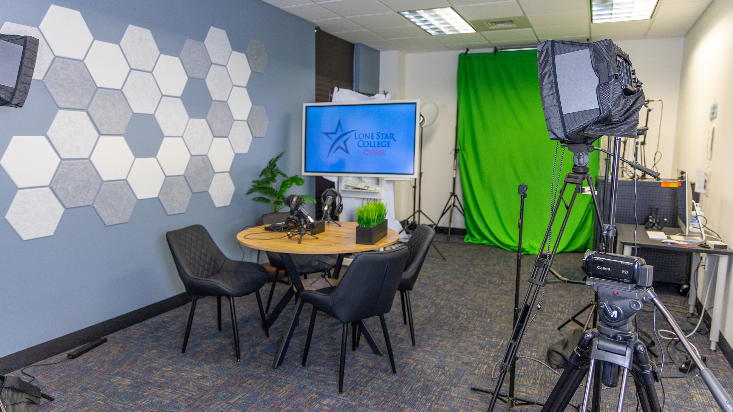 The Multimedia Center is a video production studio that enhances teaching and learning at LSC-CyFair, allowing faculty, students, and staff to create content such as videos, illustrations, podcasts, and more, all without requiring any technical expertise.