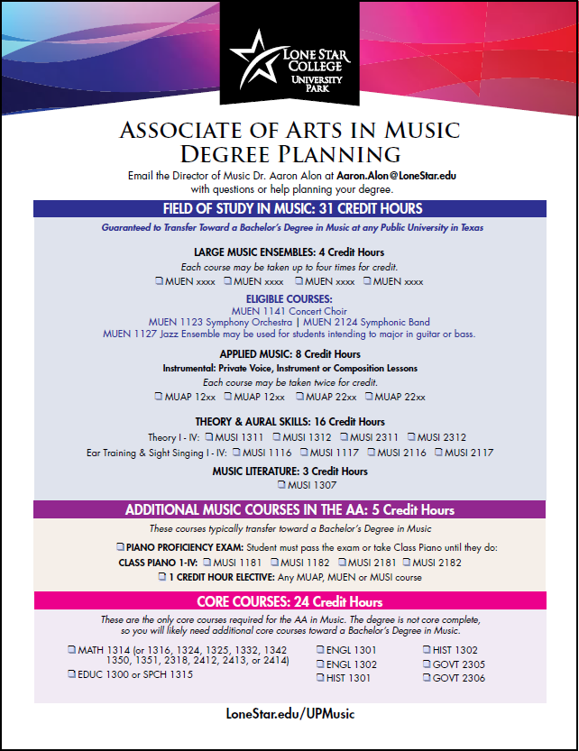 - Plan Your Degree: Email aaron.alon@lonestar.edu or Joseph.Nizich@LoneStar.edu with your name, student ID, and area of interest (voice, composition, or a particular instrument) to receive your customized degree plan to set up a meeting to discuss your degree.