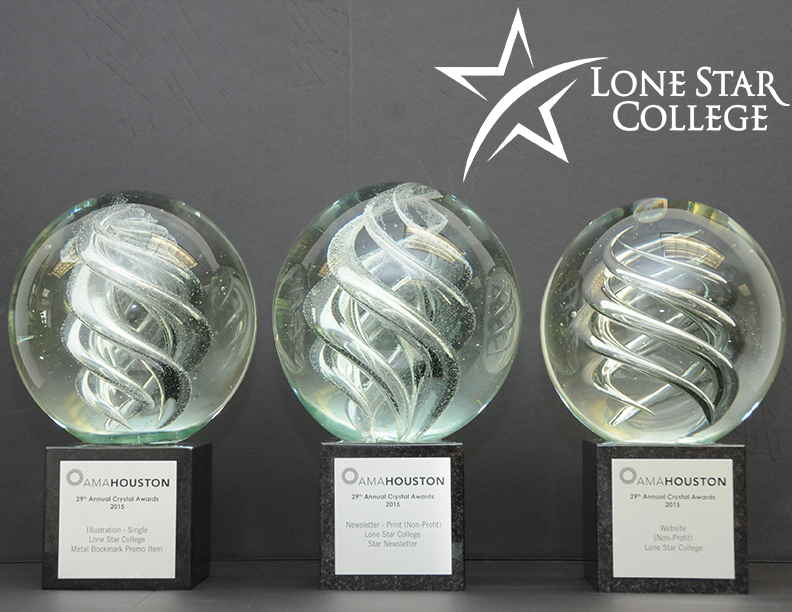 LSC received Crystal Awards for: best newsletter-print (Star newsletter, fall 2014), best illustration (Metal Bookmark Promo Item) and best nonprofit website (LoneStar.edu). In addition to the awards, LSC was a finalist in a number of other categories including advertising-magazine campaign, advertising radio campaign, advertising TV-single, product or service brochure, product or service catalog, website-most improved, and online marketing across two or more unique mediums.